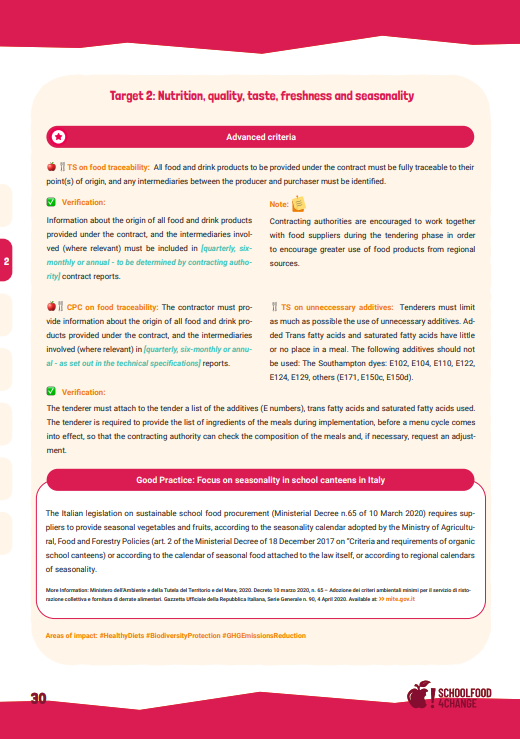 For each of these targets, the handbook presents concrete criteria, covering the full procurement cycle – from selection and technical specifications to award and contract performance clauses – that can be integrated into food and catering tenders to enable the uptake of innovative procurement practices on the markets.