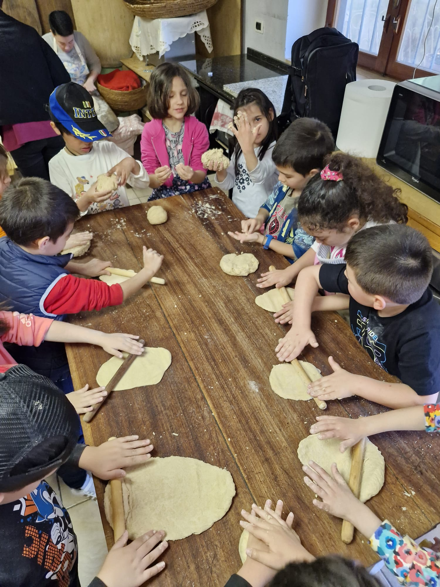 Sabina Contu, profesora del Istituto Comprensivo n. 2 Pietro Borrotzu (escuela de educación general) en Nuoro, Italia: «La foto captura un momento alegre de nuestro taller «Del grano al pan». Los niños y niñas observan con asombro mientras aprenden cada paso, desde la cosecha del trigo dorado hasta el amasado de la masa. Tienen las manos cubiertas de harina y los ojos llenos de curiosidad y emoción. Juntos, hornean con orgullo su propio pane carasau tradicional»